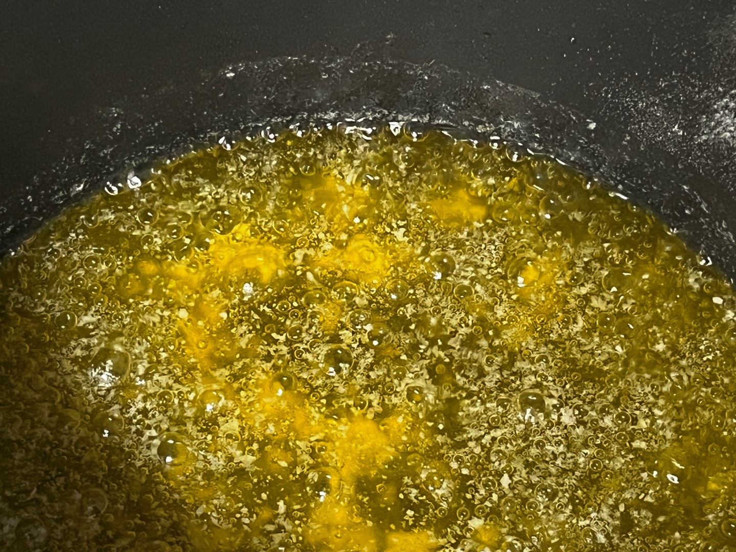 준비한 버터 전부 냄비에 넣고 약불 혹은 중불에 끓인다. 버터를 태워 풍미를 더하는 과정인데 취향에 따라 태우는 정도를 결정하면 된다. 버터가 전체적으로 끓기 시작하고 갈색빛이 보이면 불에서 내리면 된다. 원하는 정도로 버터를 태운 후에는 더 이상 잔열에 의해 타지 않도록 빼두는 것을 추천한다.