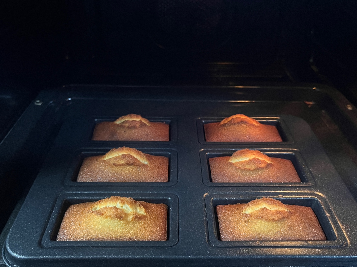 오븐에 220도로 예열하고 220도로 5분, 190도로 10분 정도 구워주면 휘낭시에가 완성된다. 휘낭시에는 낮은 온도로 굽기보다는 높은 온도로 빨리 구워내는 구움 과자이다. 220도에서의 5분은 반죽의 표면을 빠르게 익히며 190도에서 남은 시간 동안 구워지며 반죽이 부풀어 예쁜 배꼽을 만들 수 있도록 도와준다.
