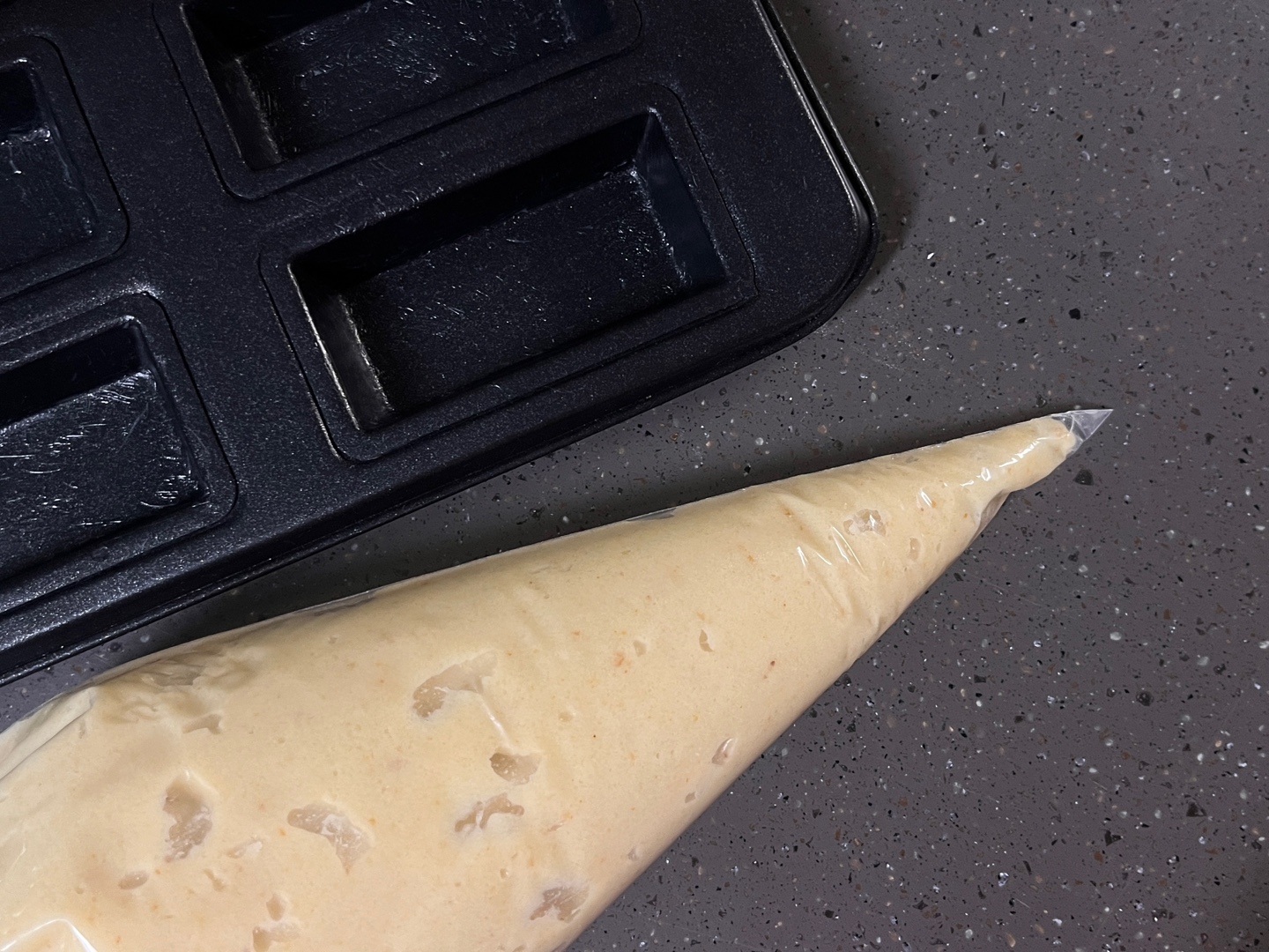 냉장 숙성된 반죽은 차가워진 버터와 함께 조금 더 쫀쫀해진 느낌이 들 것이다. 한번 전체적으로 섞은 뒤 짤주머니에 넣어 틀에 채워주는데 90% 정도 넣어주면 충분하다. 집에 짜는 주머니가 없는 경우 지퍼백에 넣어서 짜주거나 숟가락으로 반죽을 퍼서 넣어주어도 좋다.