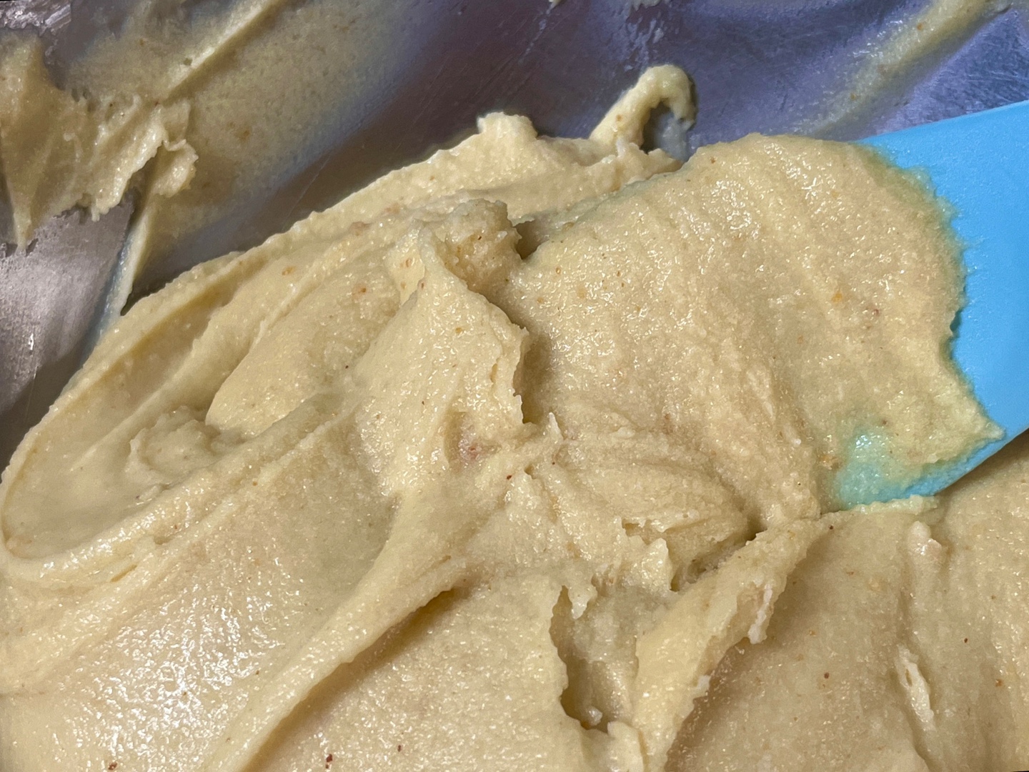 마지막으로 헤이즐넛 버터를 넣어서 섞어주면 반죽은 완성이다. 체온과 비슷하거나 약간 따뜻한 정도의 헤이즐넛 버터를 넣으면 기존의 반죽과 잘 어울어 지는데 한 번에 다 넣어서 섞기보다는 두 번 혹은 세 번에 나누어 넣어주면 조금 더 쉽게 반죽과 섞인다.